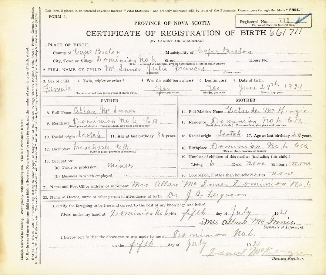21. Name and Post Office address of Informant Mrs Allan McInnes Dominion No 6