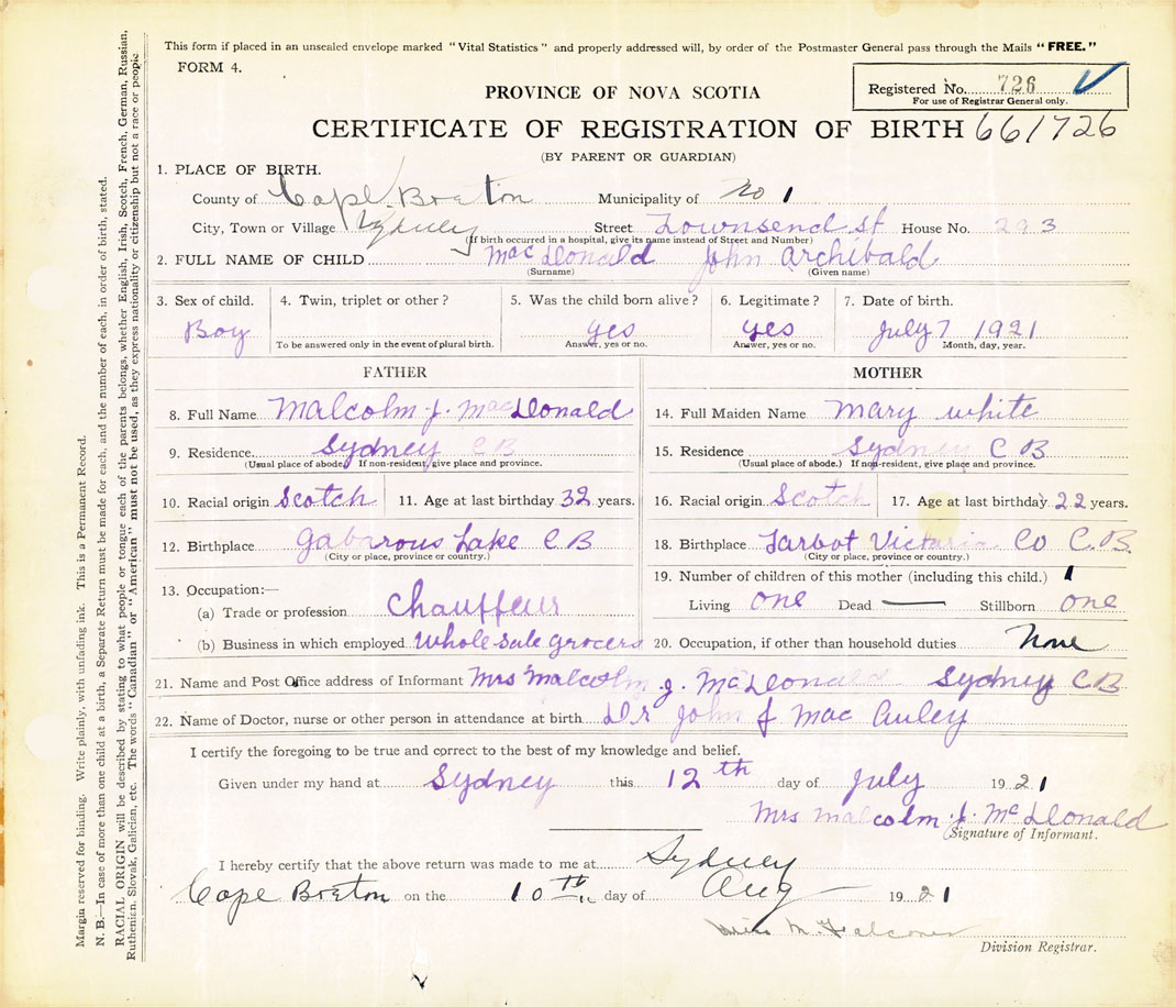 21. Name and Post Office address of Informant Mrs. Malcolm J. MacDonald Sydney, CB