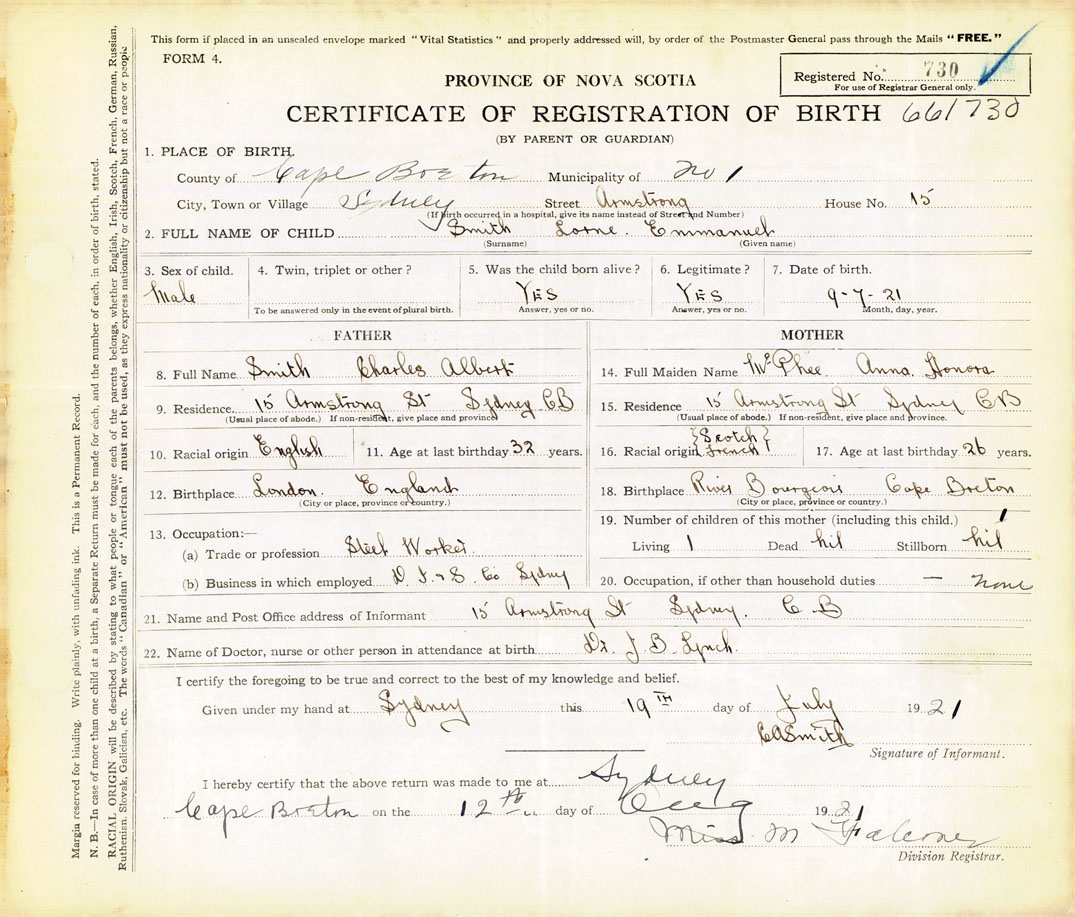 21. Name and Post Office address of Informant 15 Armstrong Street, Sydney, Cape Breton