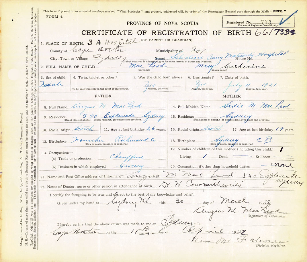 21. Name and Post Office address of Informant Angus M. MacLeod 540 Esplanade, Sydney, Cape Breton