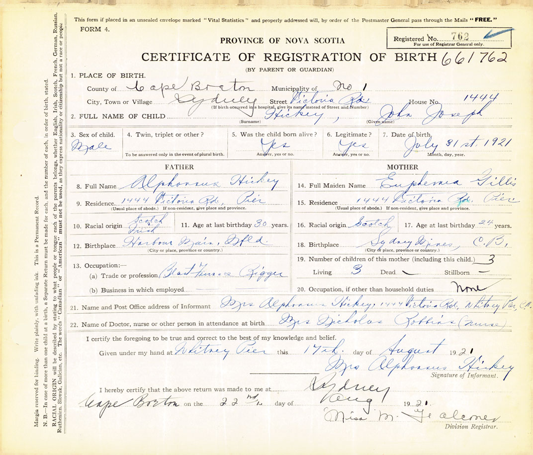 21. Name and Post Office address of Informant Mrs Alphonsus Hickey 1444 Victoria Rd, Whitney Pier, CB