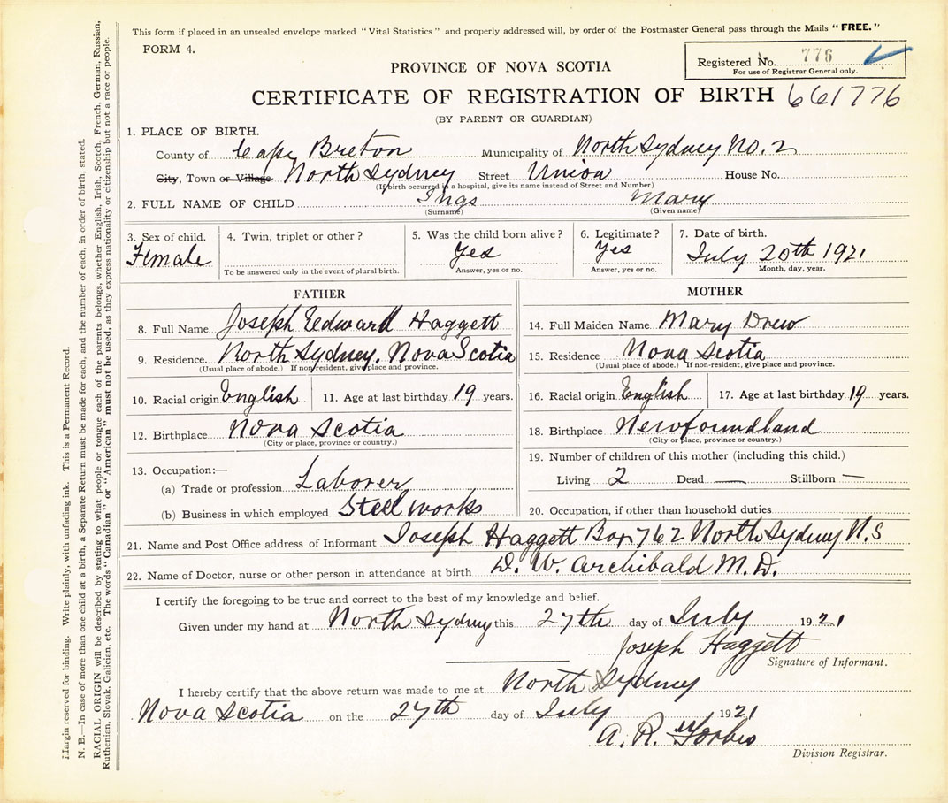 21. Name and Post Office address of Informant Joseph Haggett Box 762, North Sydney