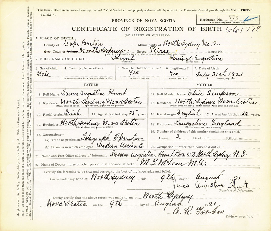 21. Name and Post Office address of Informant James Augustine Hunt Box 153, North Sydney