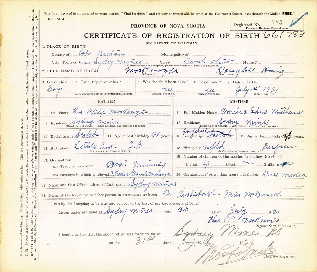 22. Name of Doctor, nurse or other person in attendance at birth Dr. Archibald, Miss McDonald