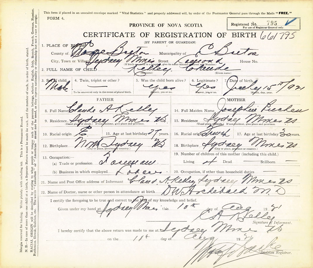 21. Name and Post Office address of Informant Claude A. Kelley Sydney Mines, Cape Breton Co., NS
