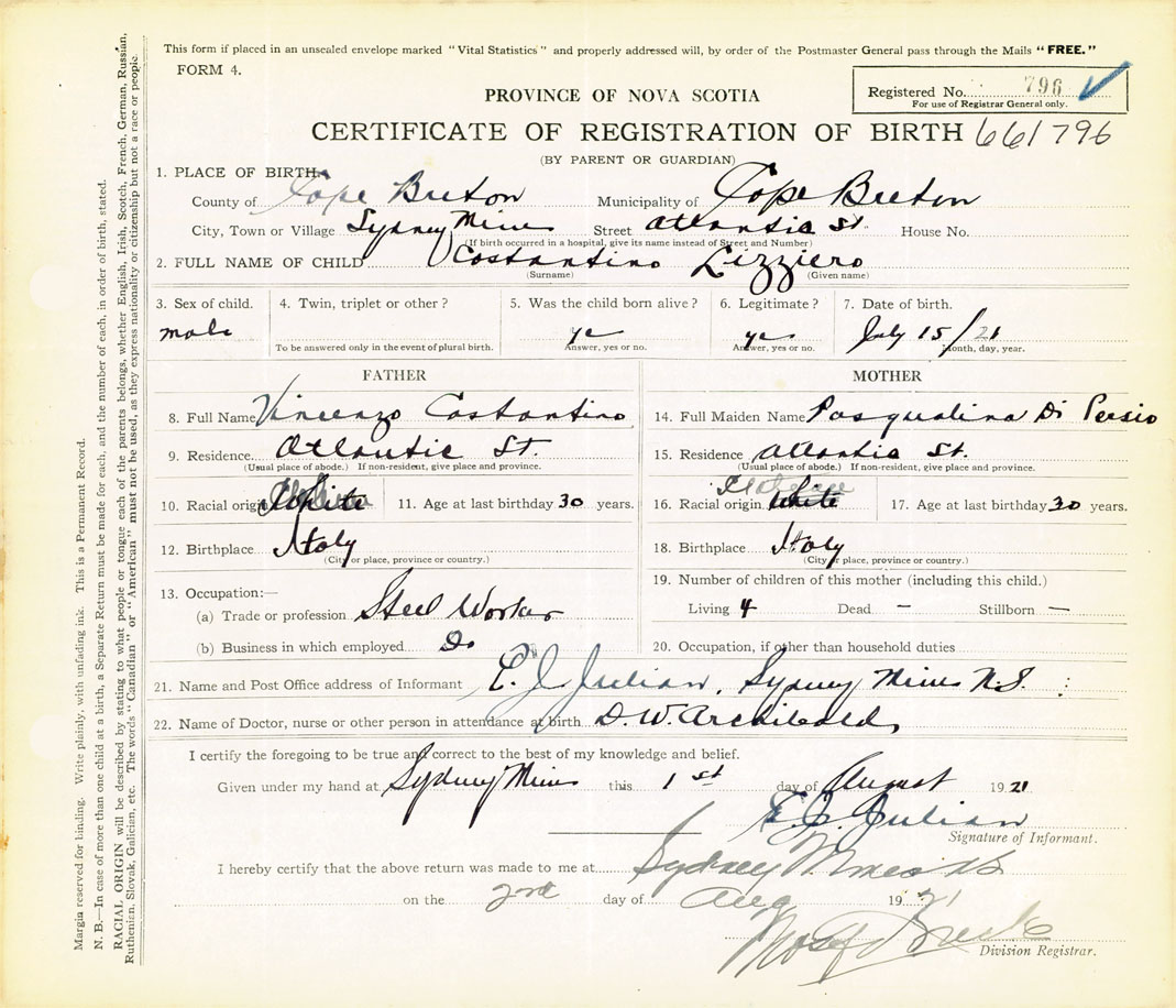 21. Name and Post Office address of Informant E. J. Julian Sydney Mines, Cape Breton Co., NS