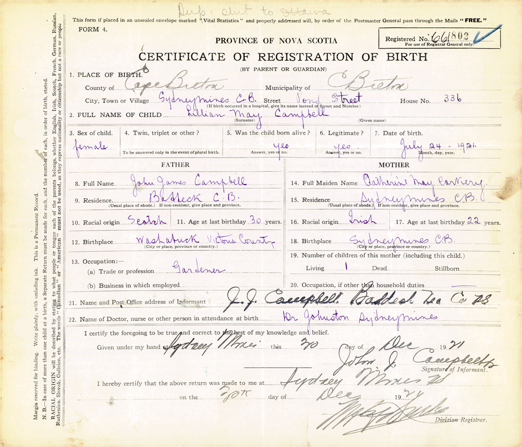22. Name of Doctor, nurse or other person in attendance at birth Dr. Johnston, Sydney Mines