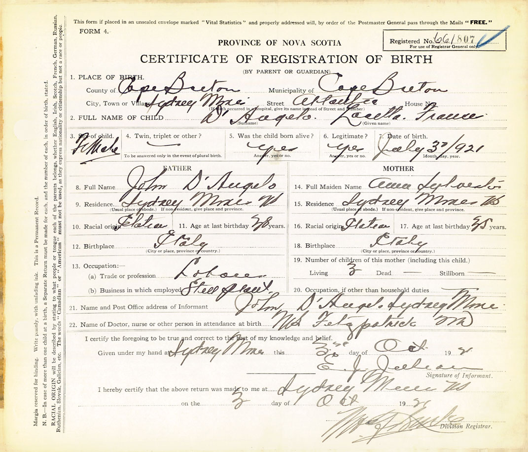 21. Name and Post Office address of Informant John D'Angelo Sydney Mines, Cape Breton