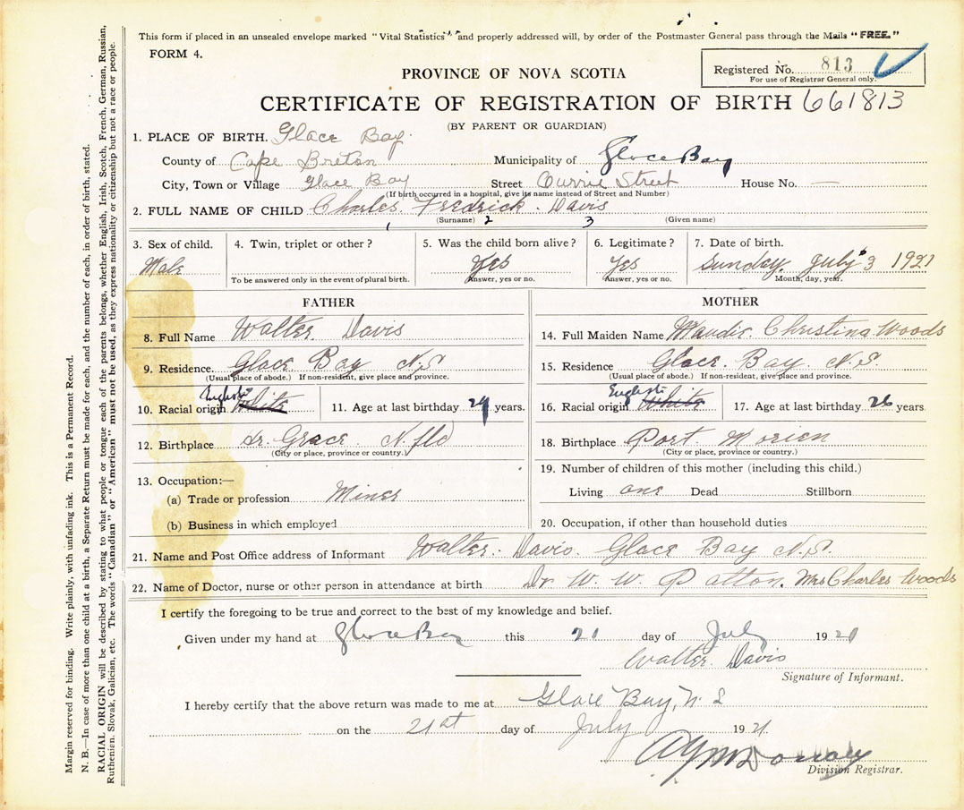 21. Name and Post Office address of Informant Walter Davis Glace Bay, Cape Breton