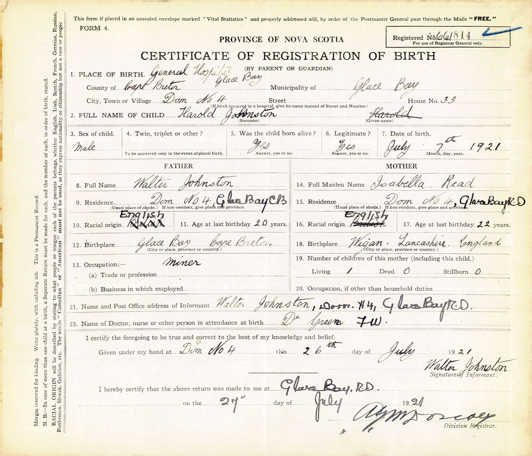 21. Name and Post Office address of Informant Walter Johnston Dominion No. 4, Glace Bay, Cape Breton