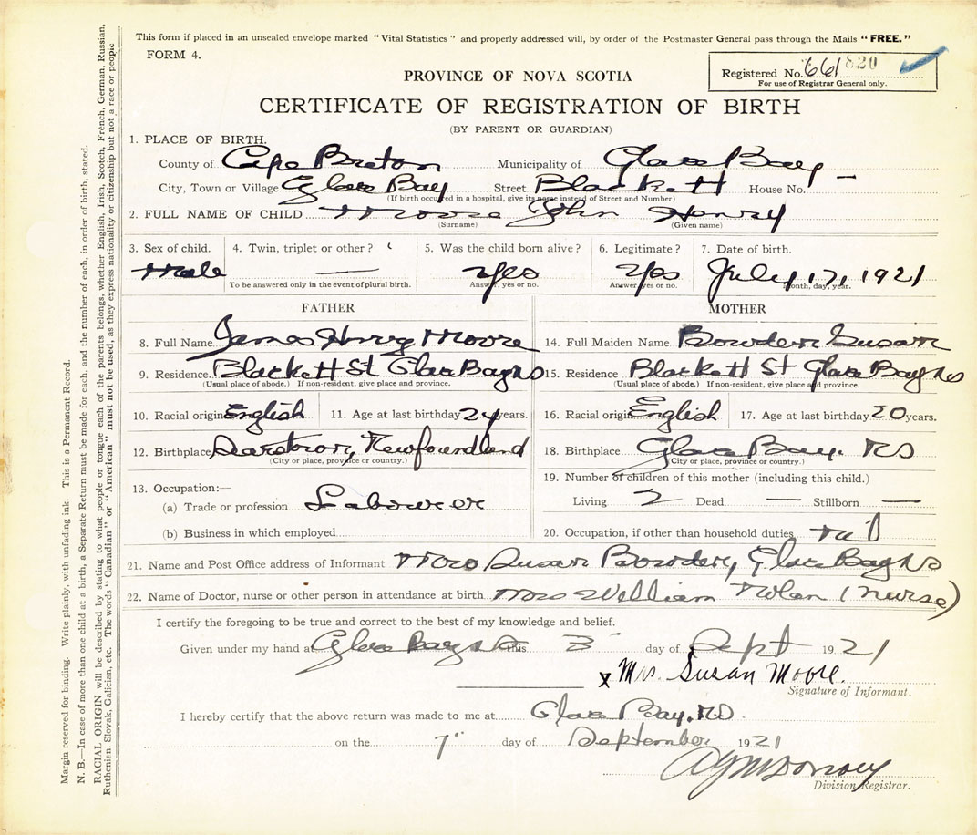 21. Name and Post Office address of Informant Mrs. Susan Bowden Glace Bay, Cape Breton
