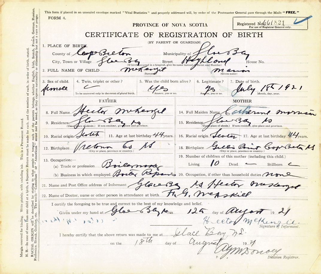 21. Name and Post Office address of Informant Hector McKenzie Glace Bay, Cape Breton