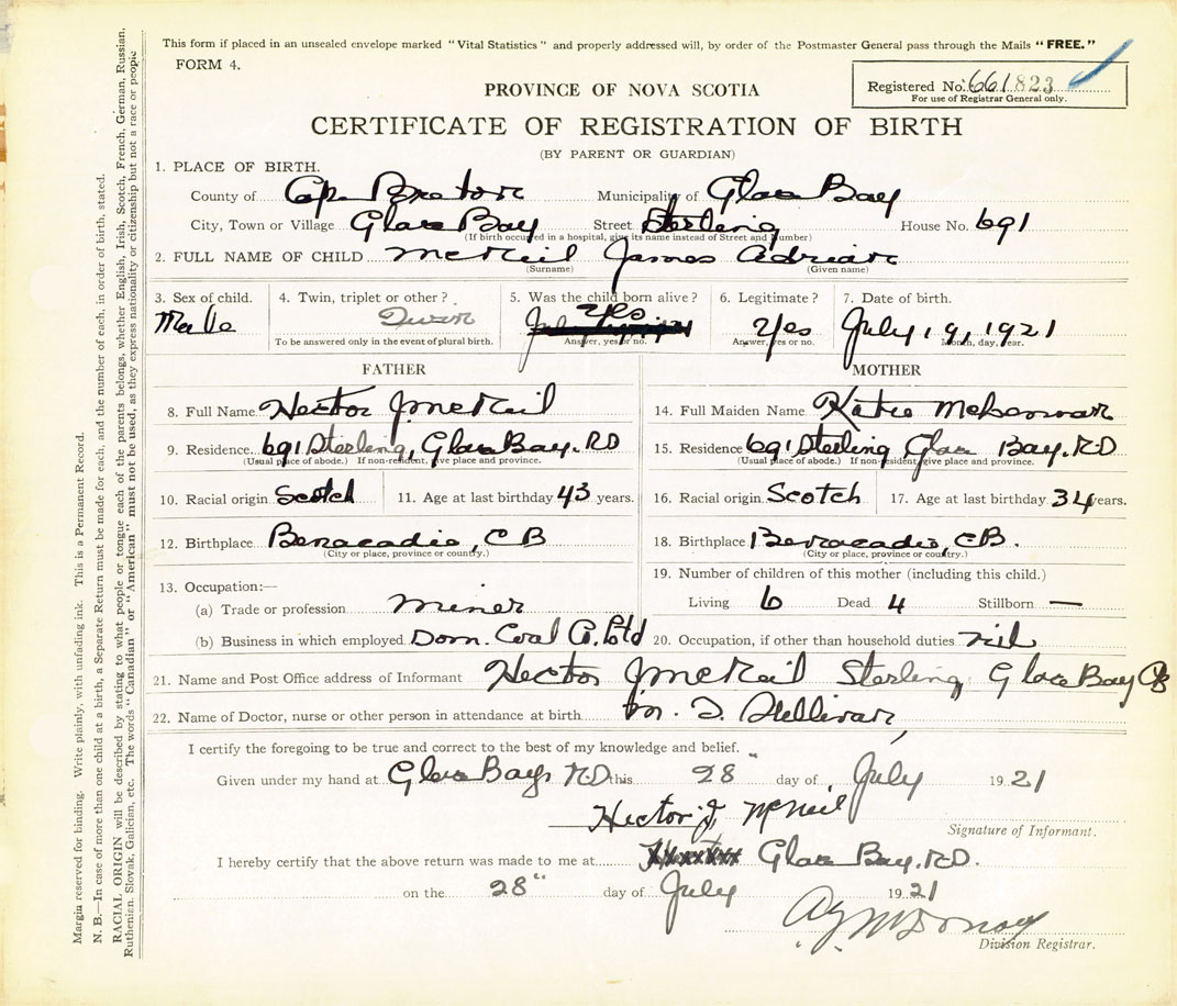 21. Name and Post Office address of Informant Hector J McNeil Sterling, Glace Bay, CB