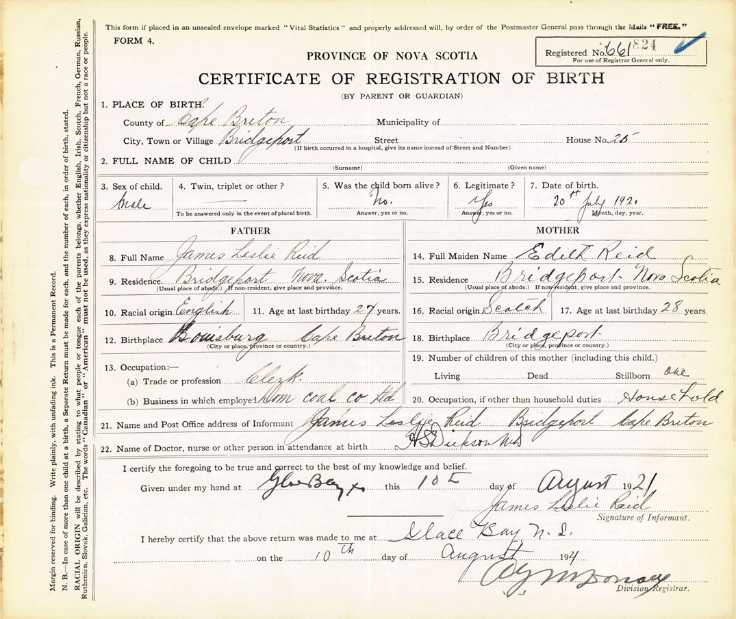 21. Name and Post Office address of Informant James Leslie Reid Bridgeport, Cape Breton