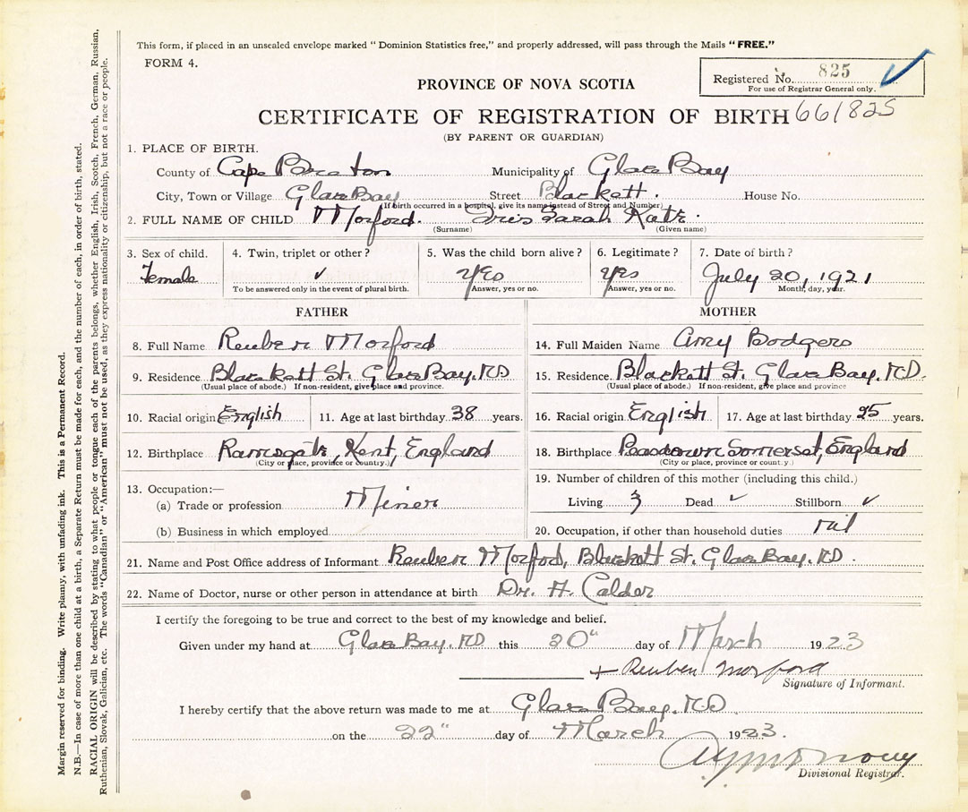 21. Name and Post Office address of Informant Reuben Morford Blackett Street, Glace Bay