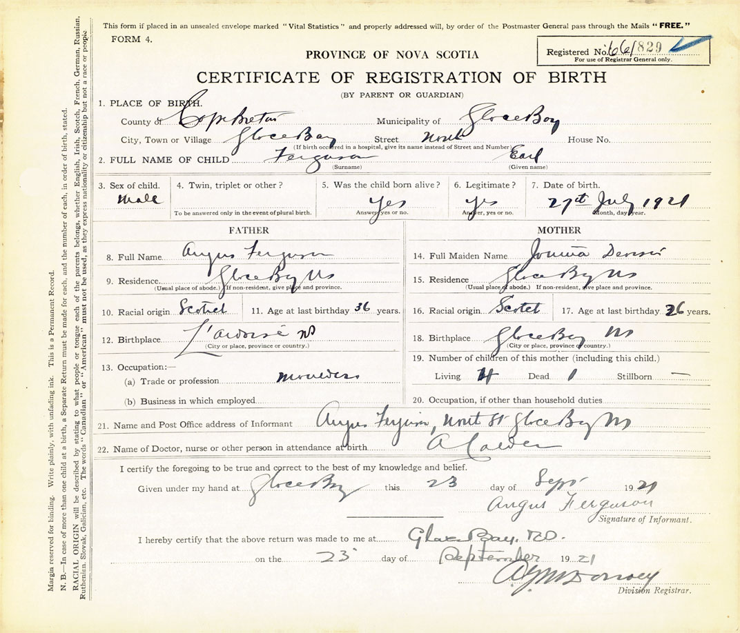 21. Name and Post Office address of Informant Angus Ferguson North Street, Glace Bay, Cape Breton