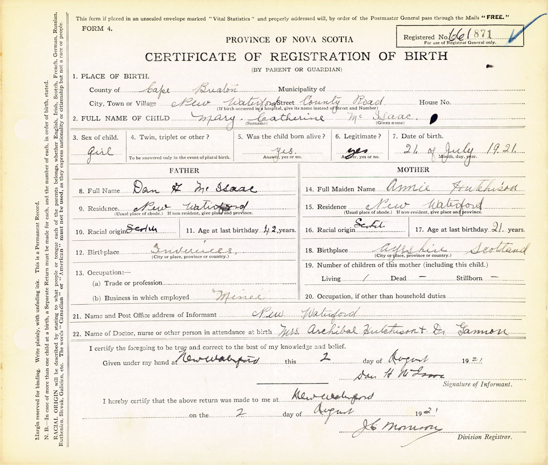 21. Name and Post Office address of Informant Mrs. Archibald Hutchison New Waterford Cape Breton