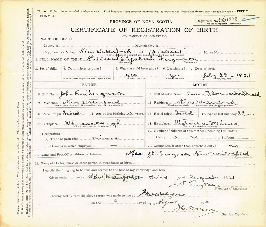 21. Name and Post Office address of Informant Mrs. J D Ferguson New Waterford