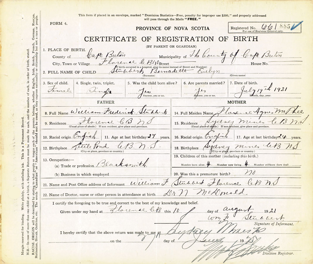 21. Name and Post Office address of Informant William F Stubbert Florence, Cape Breton