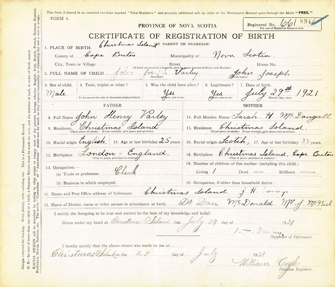 21. Name and Post Office address of Informant J. H. Varley Christmas Island