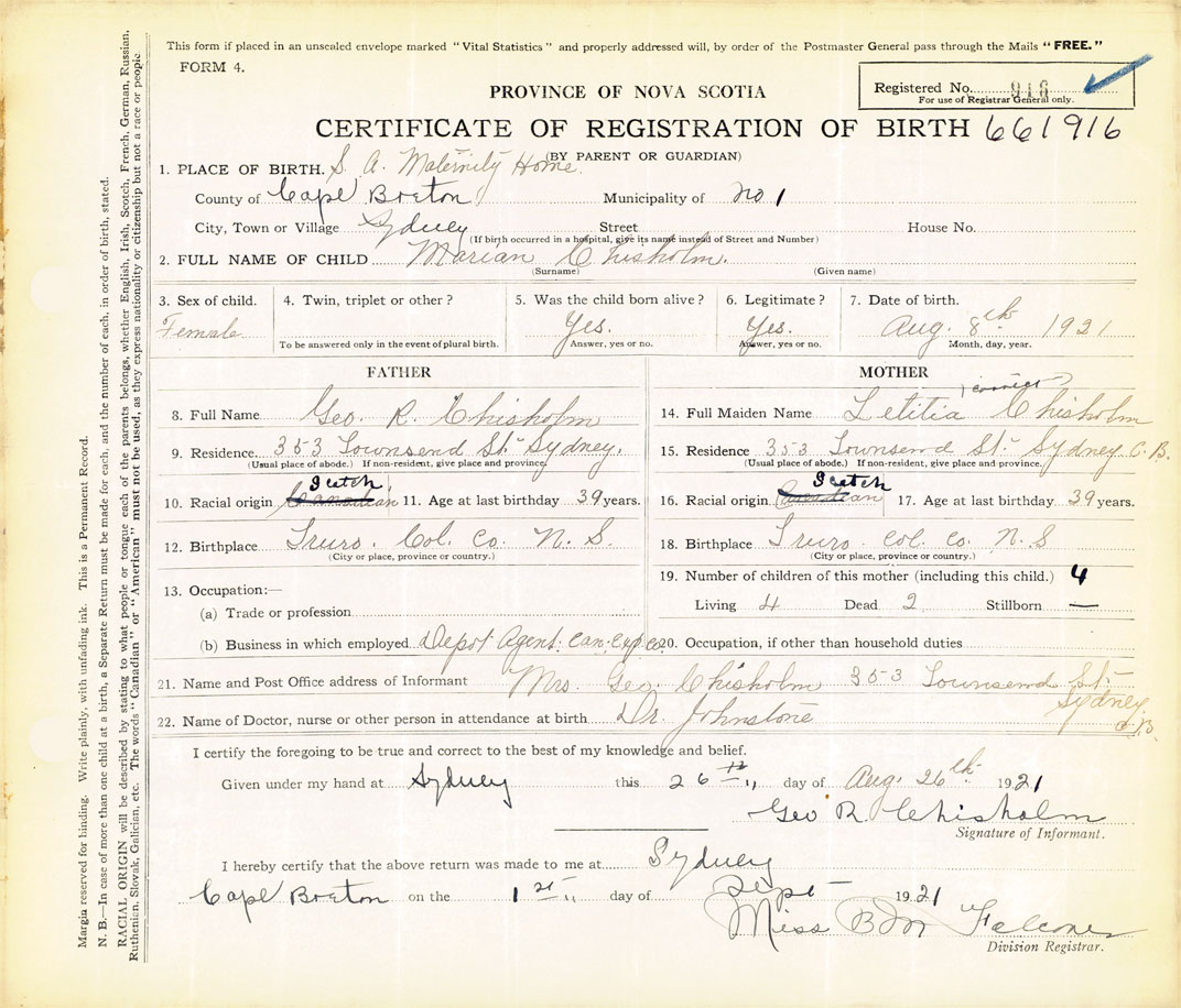21. Name and Post Office address of Informant Mrs. George Chisholm 353 Townsend Street, Sydney, Cape Breton