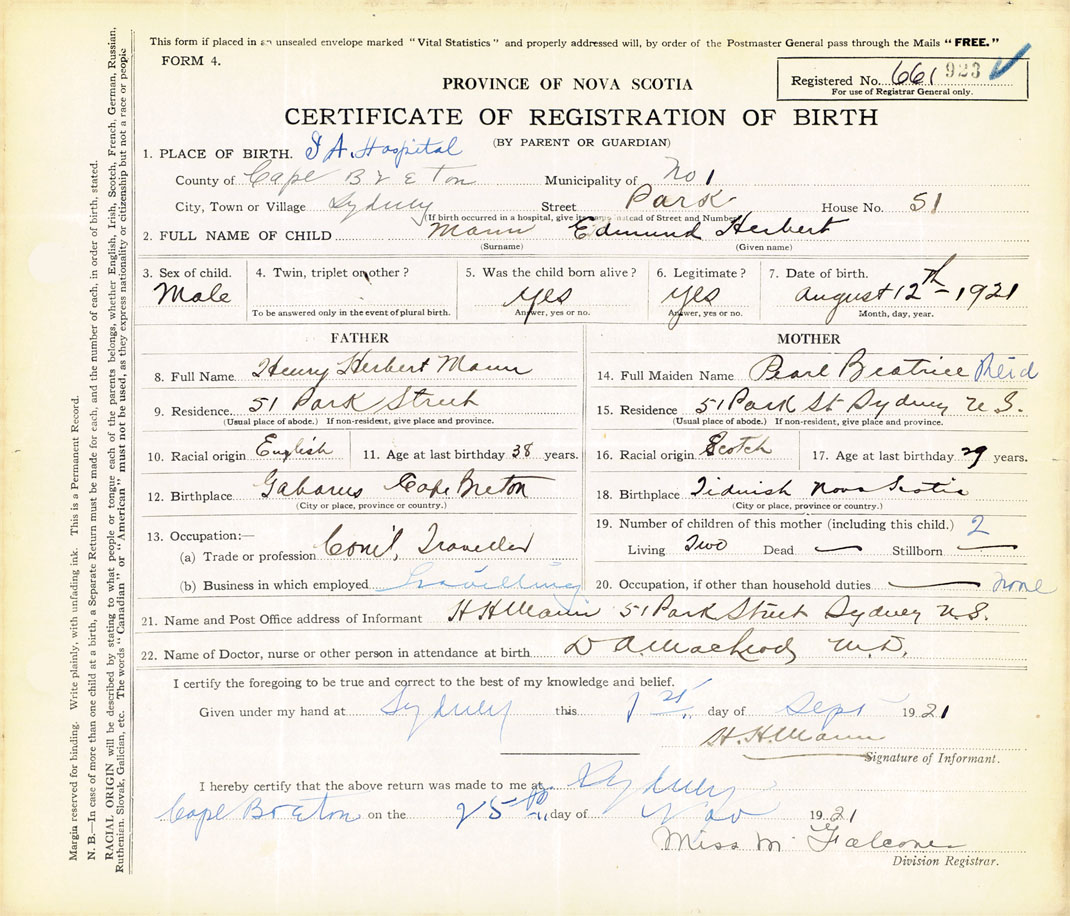 21. Name and Post Office address of Informant H. H. Mann 51 Park Street, Sydney, Cape Breton