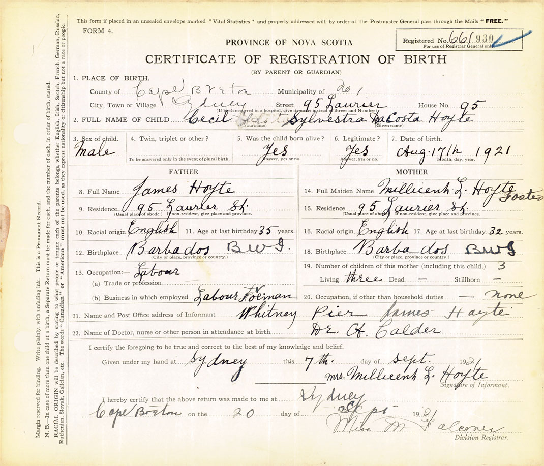 21. Name and Post Office address of Informant James Hoyte Whitney Pier, Sydney, Cape Breton