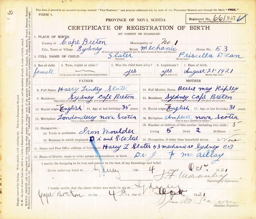 21. Name and Post Office address of Informant Harry L Slater 53 Mechanic Street, Sudney, Cape Breton