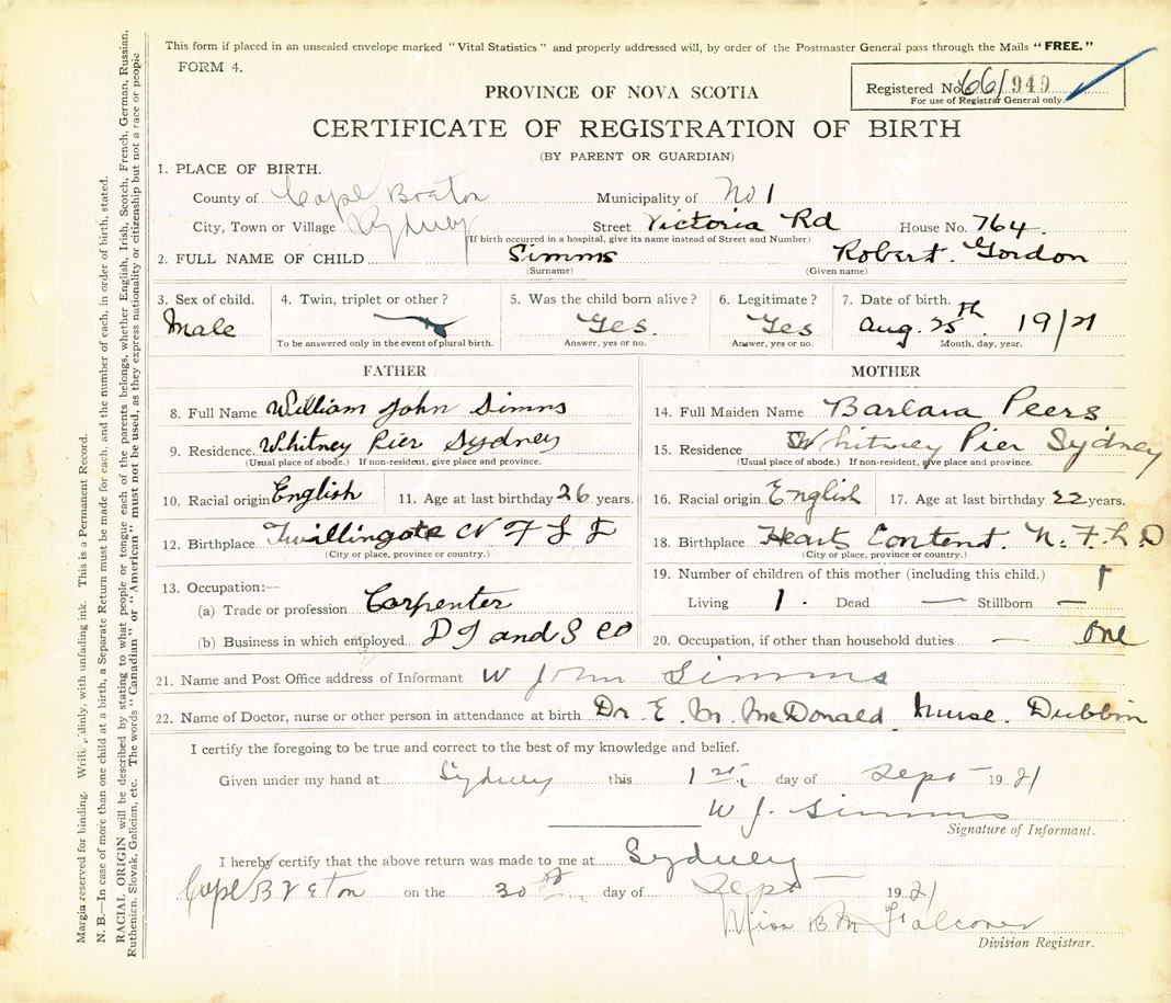 Male Birth Registration: Year: 1921 number: 66100949