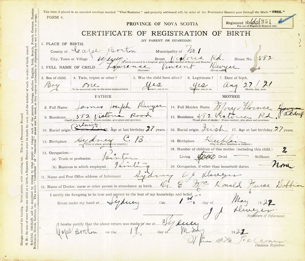 21. Name and Post Office address of Informant J. J. Dwyer 582 Victoria Road, Sydney, Cape Breton