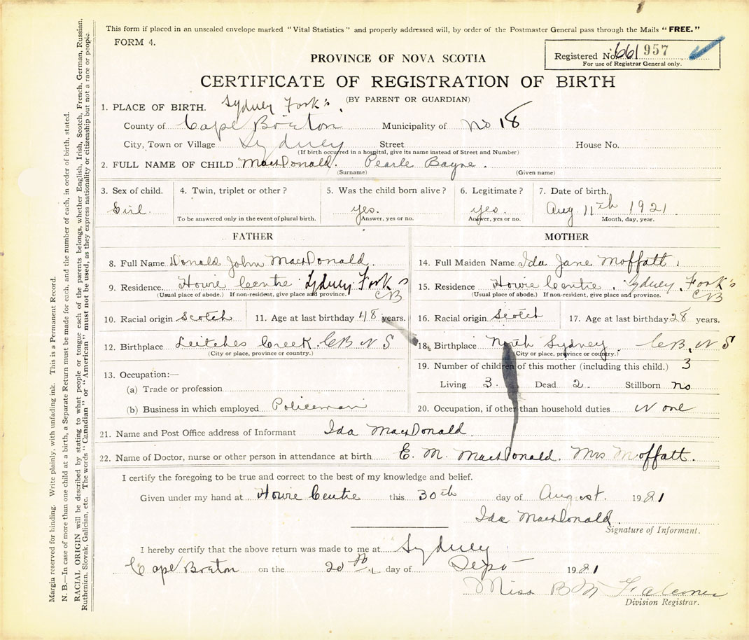 18. Birthplace North Sydney, Cape Breton Co., NS
