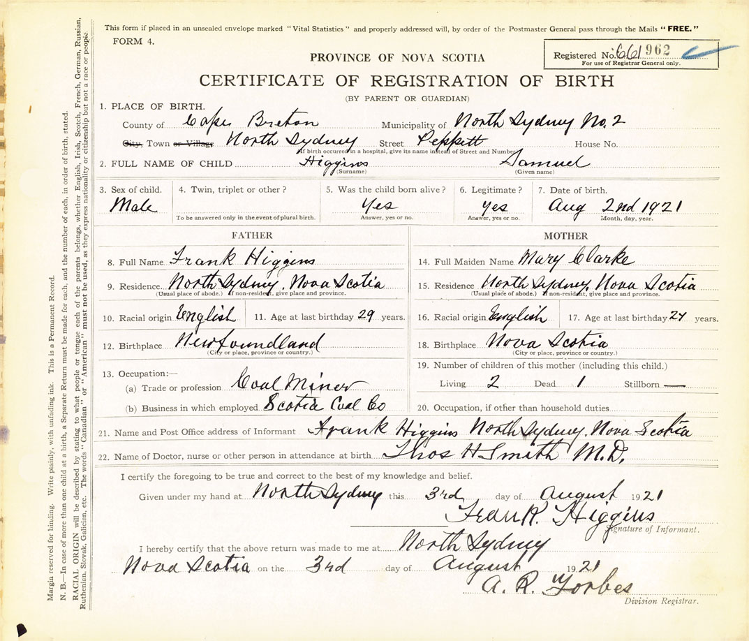 21. Name and Post Office address of Informant Frank Higgins North Sydney, Cape Breton