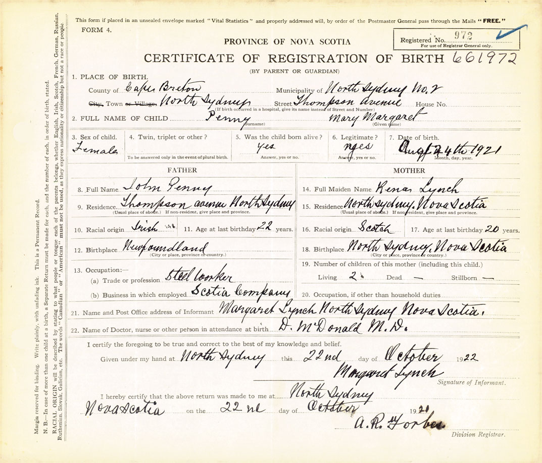 21. Name and Post Office address of Informant Margaret Lynch North Sydney, Cape Breton