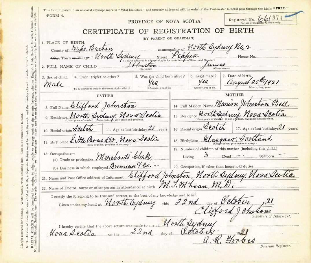 21. Name and Post Office address of Informant Clifford Johnston North Sydney, Cape Breton