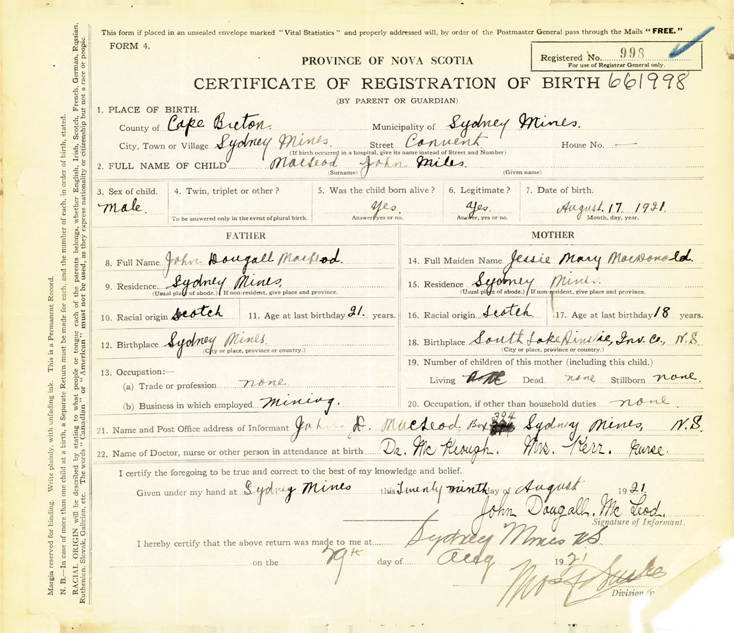 21. Name and Post Office address of Informant John D. MacLeod box 294 Sydney Mines