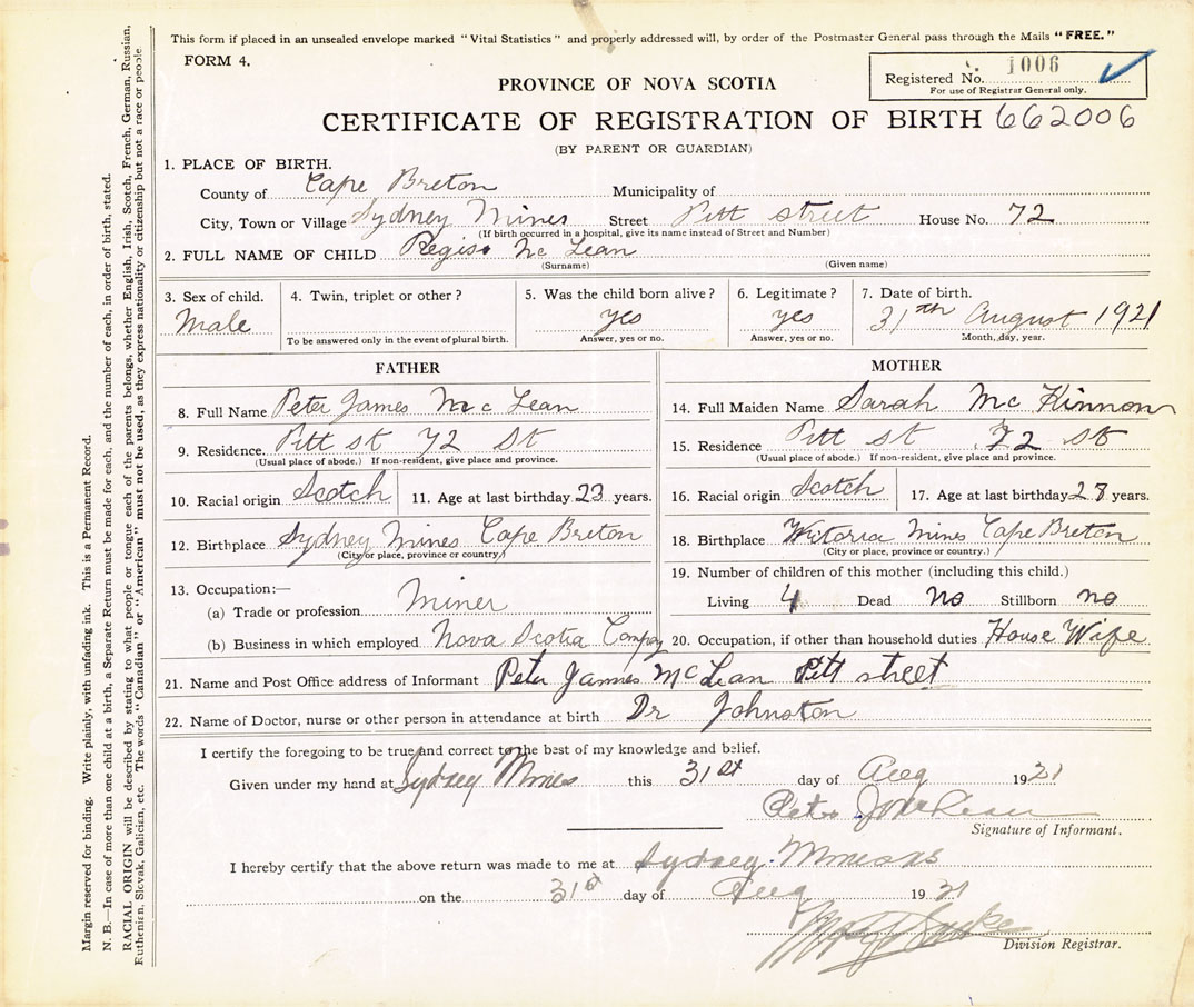 21. Name and Post Office address of Informant Peter James McLean Pitt St. Sydney Mines
