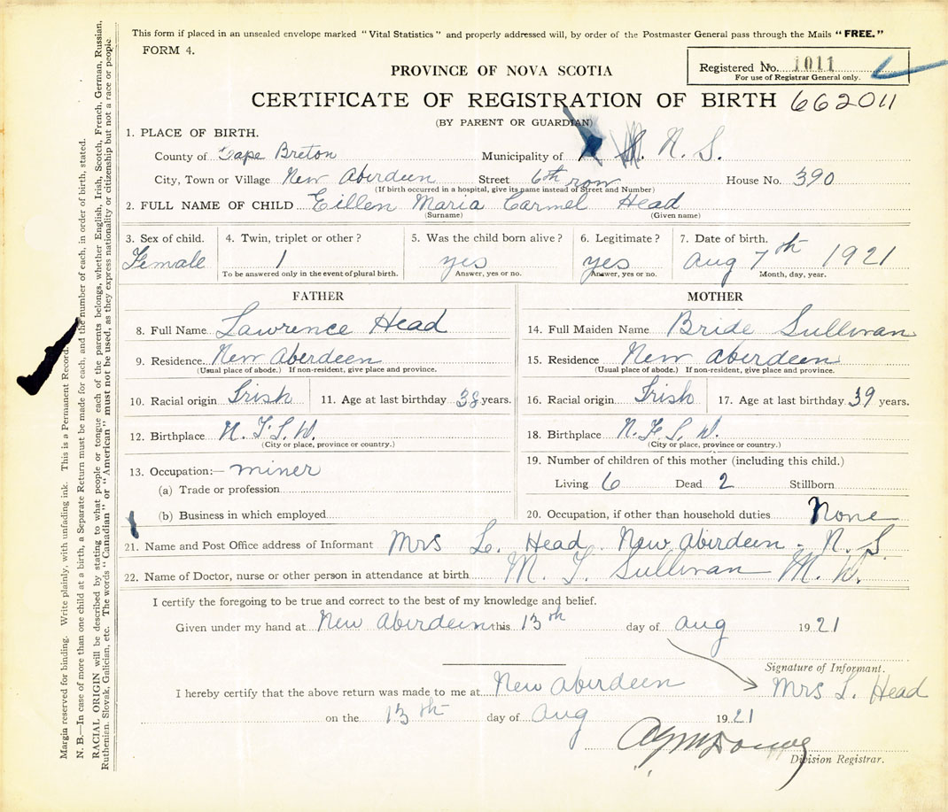 21. Name and Post Office address of Informant Mrs. L. Head New Aberdeen, Cape Breton