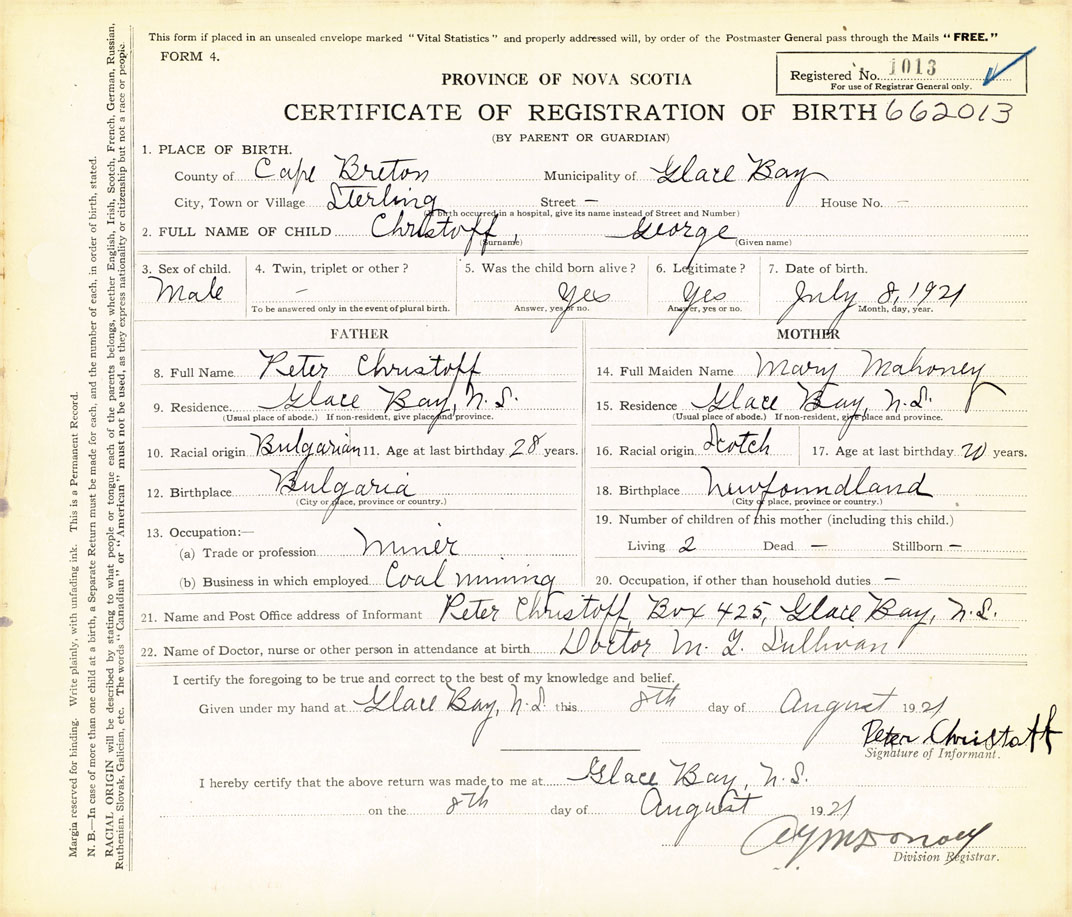 21. Name and Post Office address of Informant Peter Christoff Box 425, Glace Bay, Cape Breton