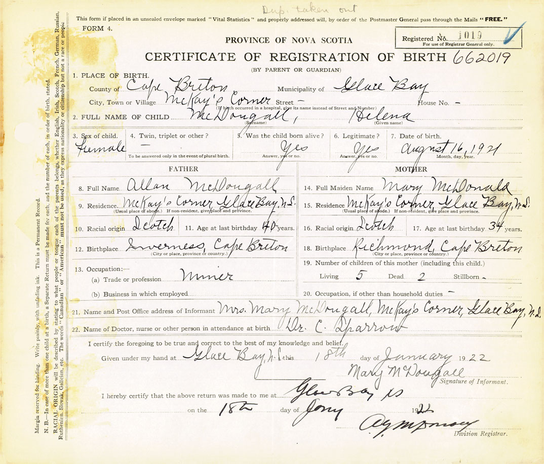 21. Name and Post Office address of Informant Mrs. Mary Macdougall McKays Corner, Glace Bay, Cape Breton
