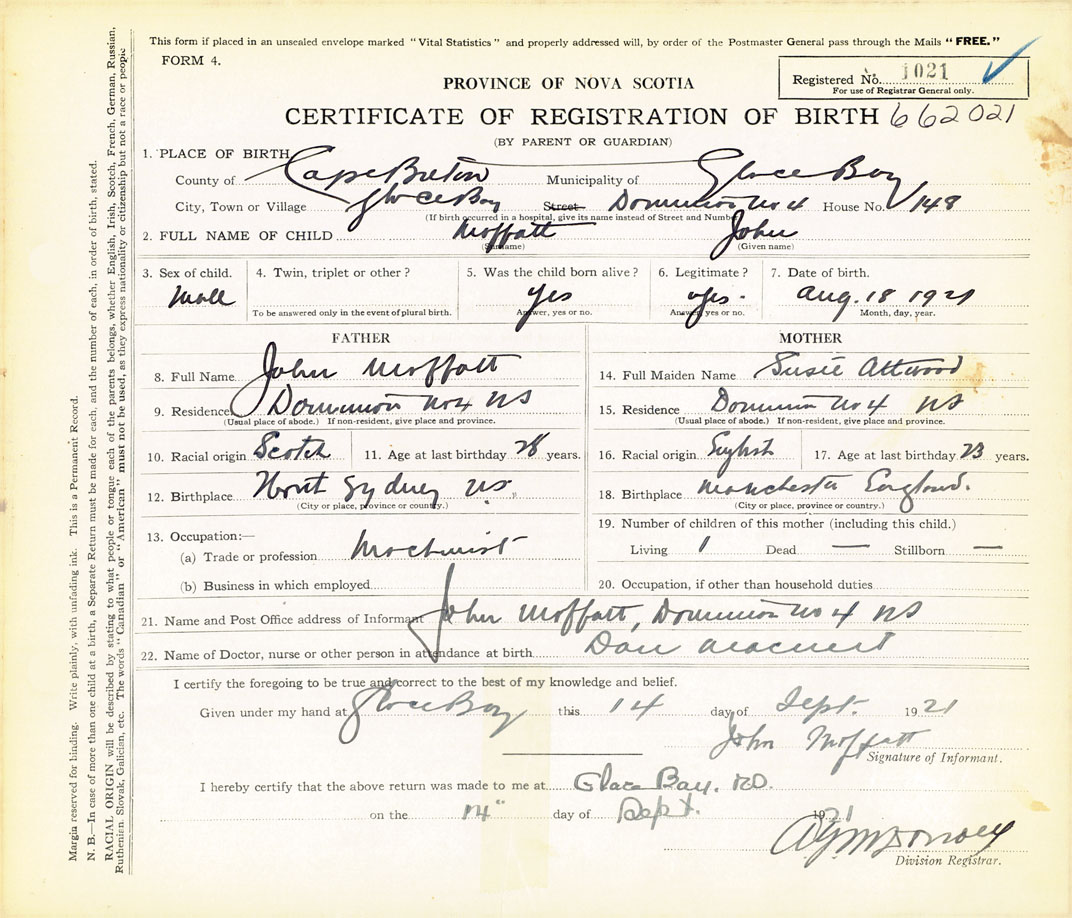 21. Name and Post Office address of Informant John Moffatt Dominion No. 4, Cape Breton