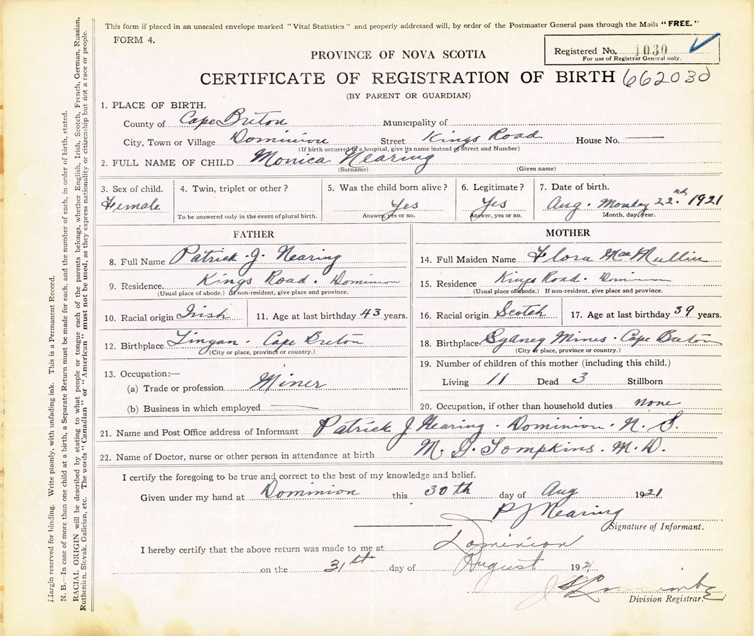 21. Name and Post Office address of Informant Patrick J. Nearing Dominion, Cape Breton