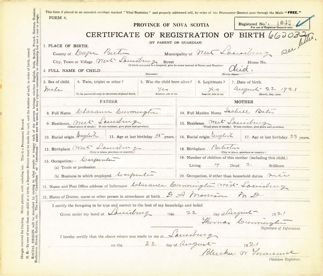 21. Name and Post Office address of Informant Clarance Cunnington West Louisbourg, Cape Breton