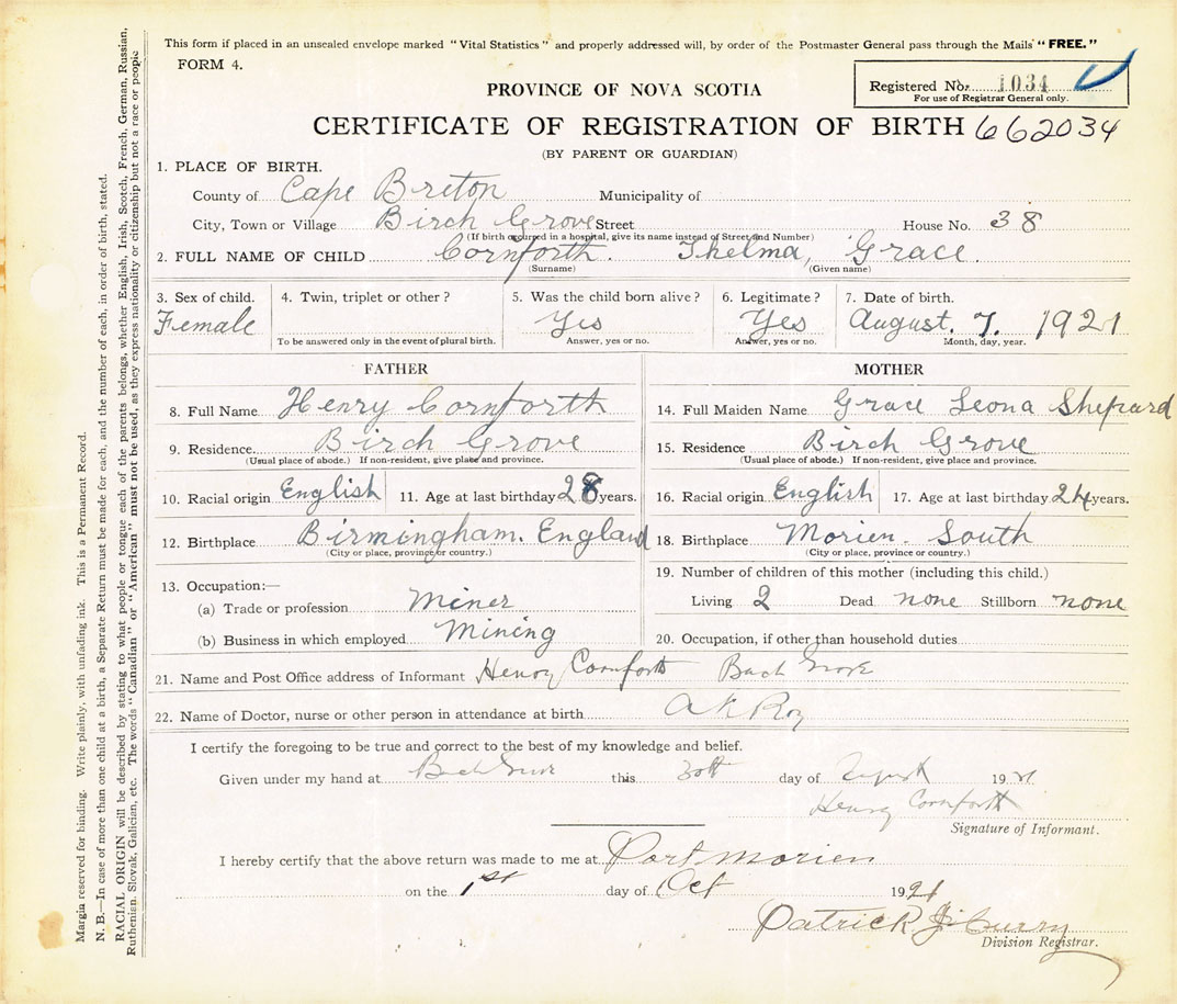 21. Name and Post Office address of Informant Henry Cornforth Birch Grove, Cape Breton