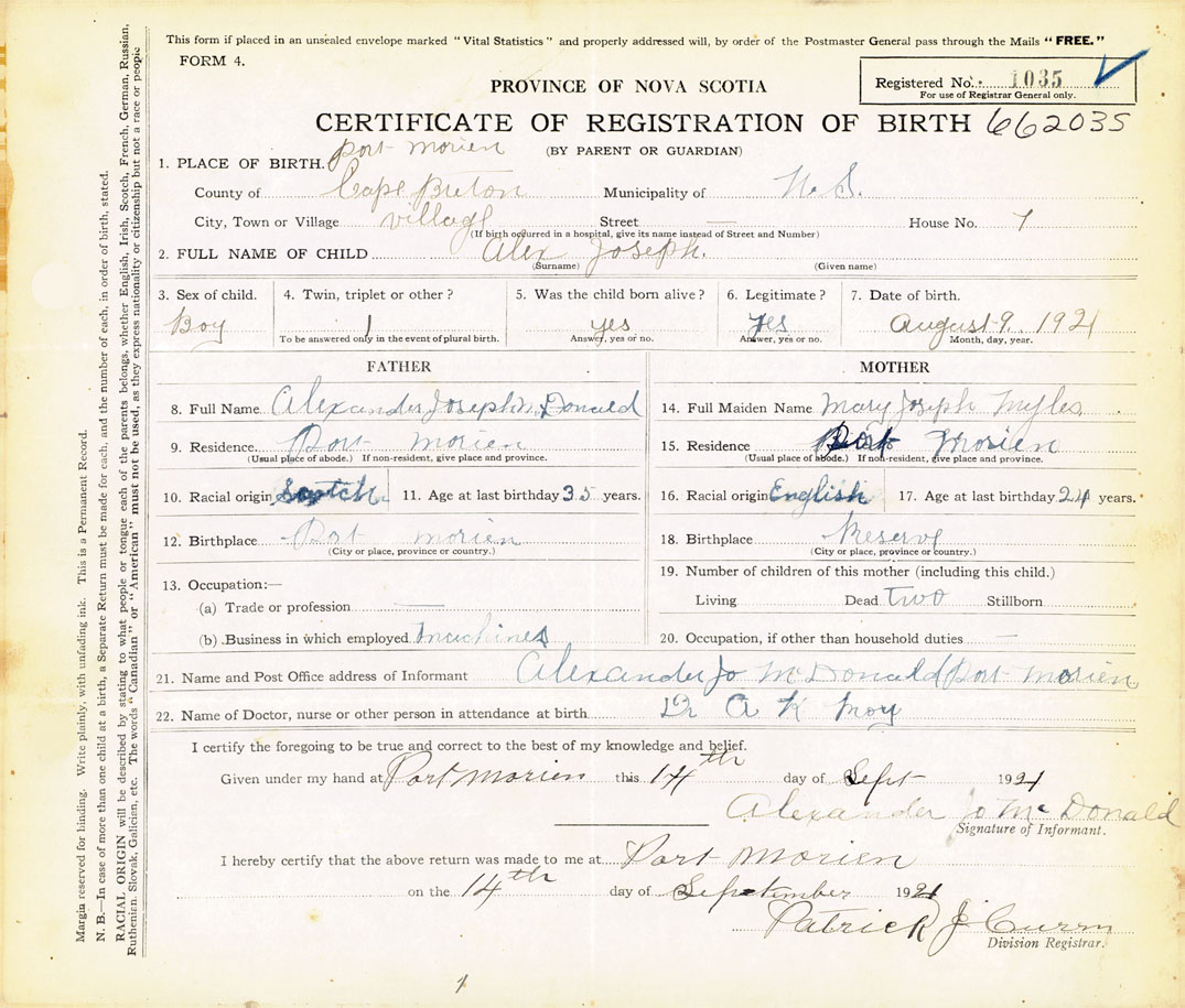 21. Name and Post Office address of Informant Alexander J. McDonald Port Morien, Cape Breton