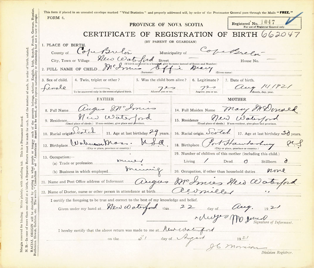 21. Name and Post Office address of Informant Angus McInnis New Waterford