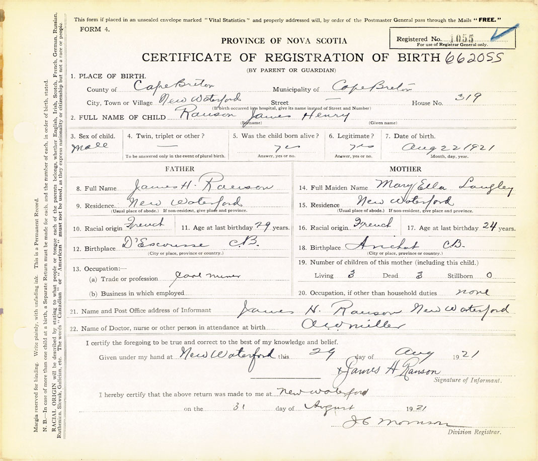 21. Name and Post Office address of Informant James H. Ranson New Waterford, Cape Breton