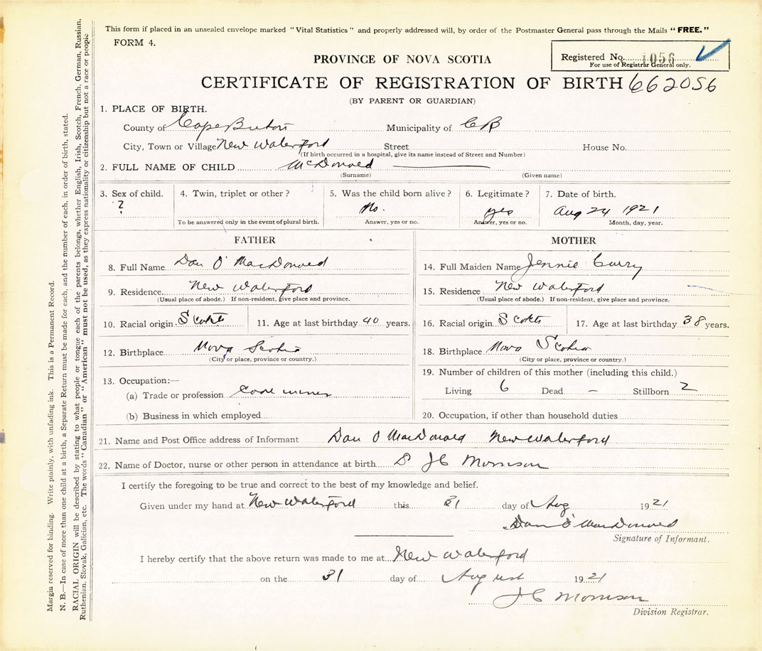 21. Name and Post Office address of Informant Dan O. MacDonald New Waterford, Cape Breton