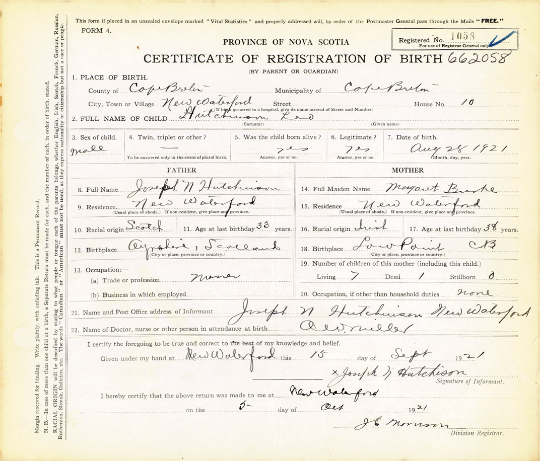21. Name and Post Office address of Informant Joseph N. Hutchinson New Waterford, Cape Breton