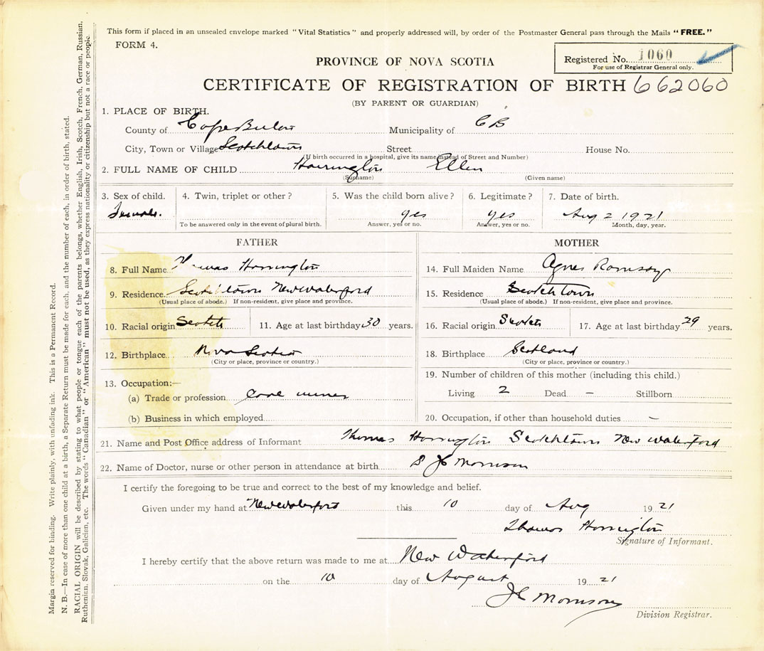 21. Name and Post Office address of Informant Thomas Harrington Scotchtown, New Waterford, Cape Breton
