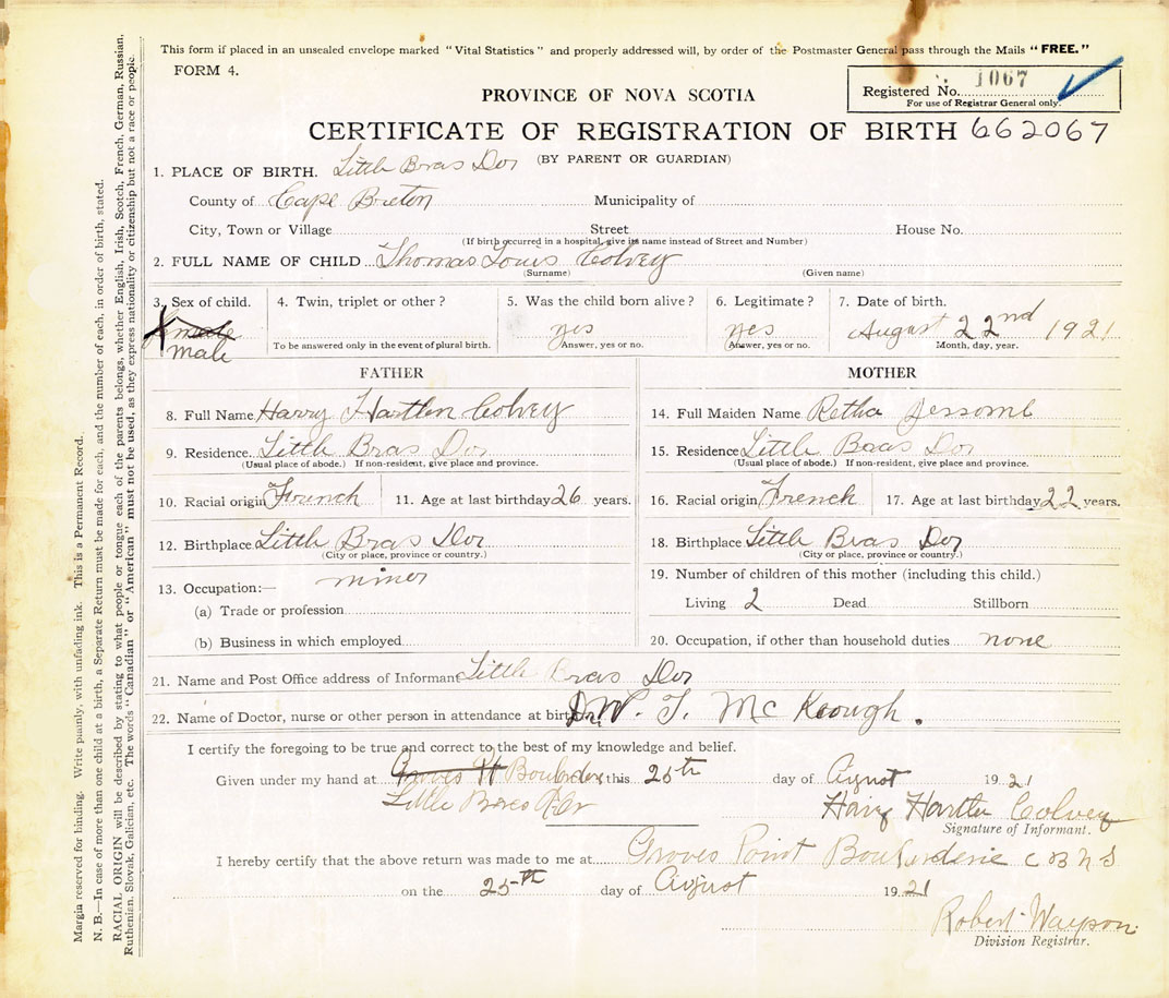 21. Name and Post Office address of Informant Harry Hartlen Colvey Little Bras D'or